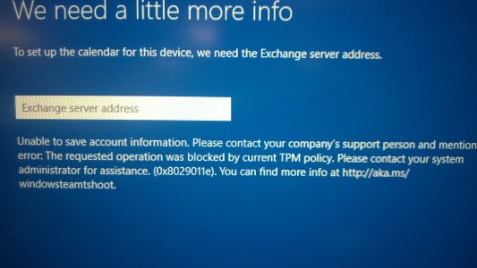 Having a problem with a 2nd Surface hub we bought. Attaching it to the LAN, it first says it can't connect to exchange autodiscover so needs the info manually, then when we type in the exchange server address, I get the requested operation was blocked by current TPM policy.