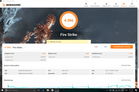 Hey guys, I picked up a i7/16/512/965 Surface Book last night, and thought I would throw some initial benchmarks out there as they were some what limited when I was researching. I will open with a complete screen shot of the Firestrike standard score. Folks had projected between 4200-4400 for the total score, but didn't include things like the graphics only score. As the total score includes CPU, and the SB uses a dual core CPU as opposed to a quad core, it can skew the score a bit. My system posted 4396 for the total score, and 5156 for the graphics score (see attached).