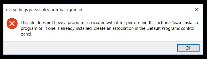 I also get this when I try to run 'Personalization' and 'Display' from right clicking the desktop. No default program associated.